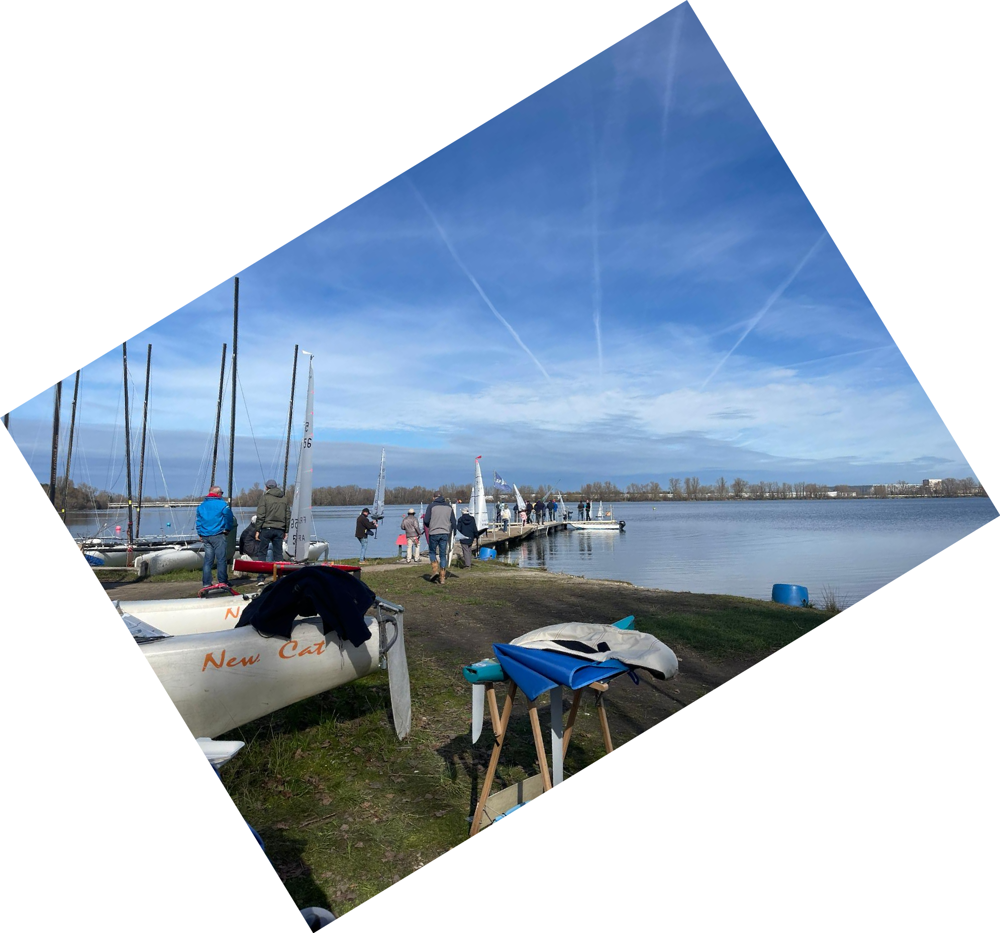 Ce matin dimanche 18 à 11h00, le plan d'eau est tel un miroir - le soleil est bien là toutefois. Les espoirs de naviguer sont minces. On attend le vent de midi !