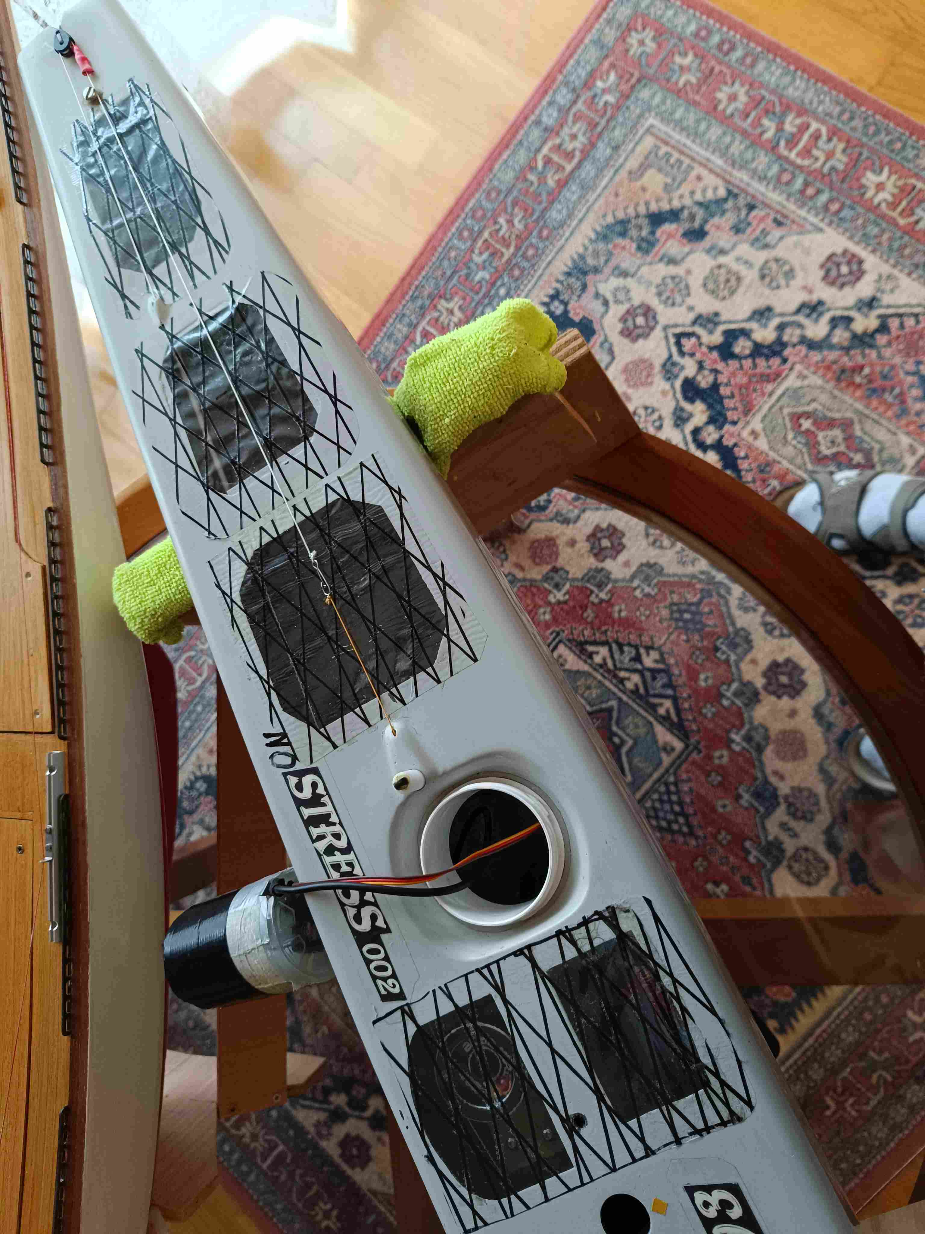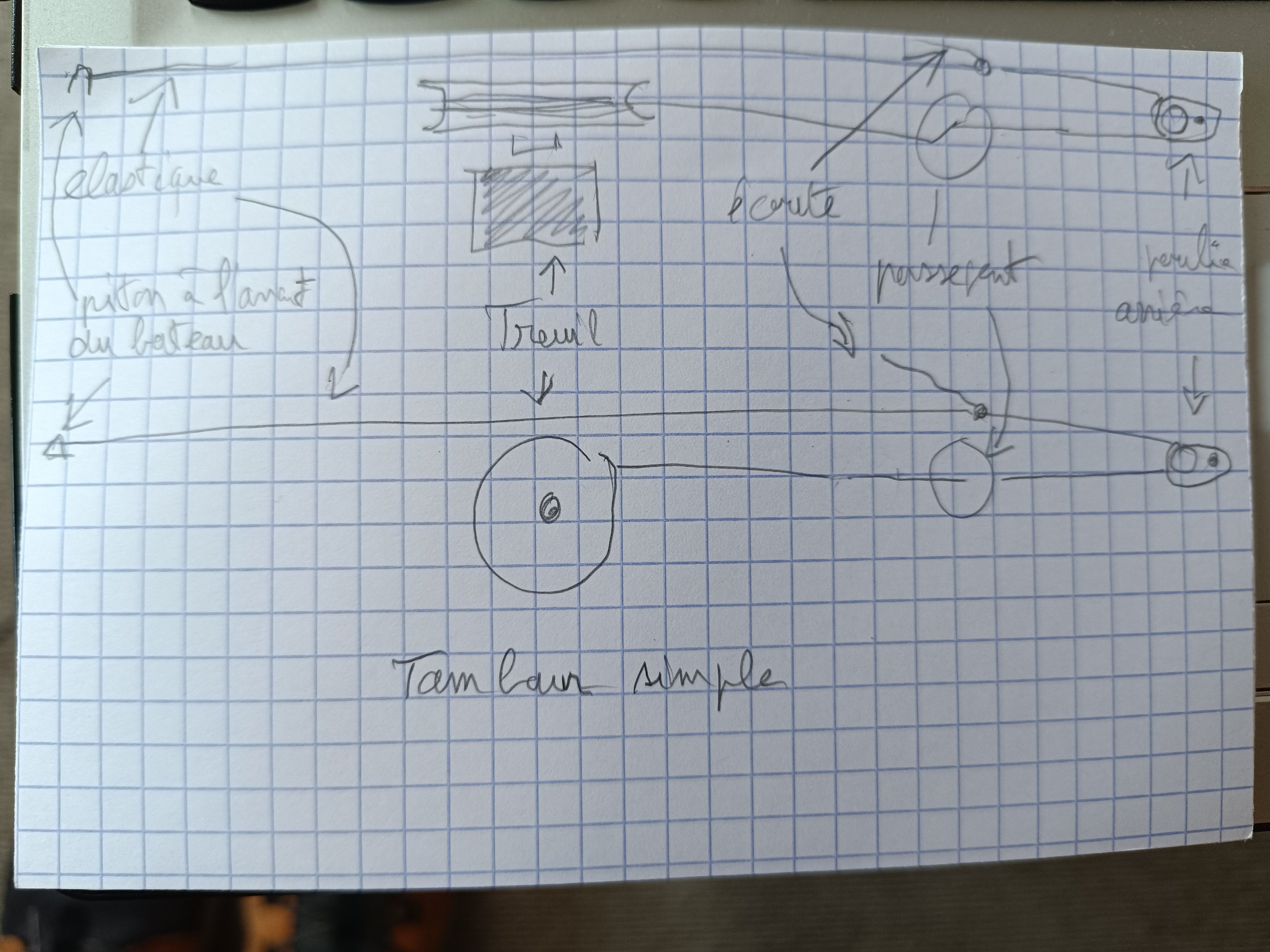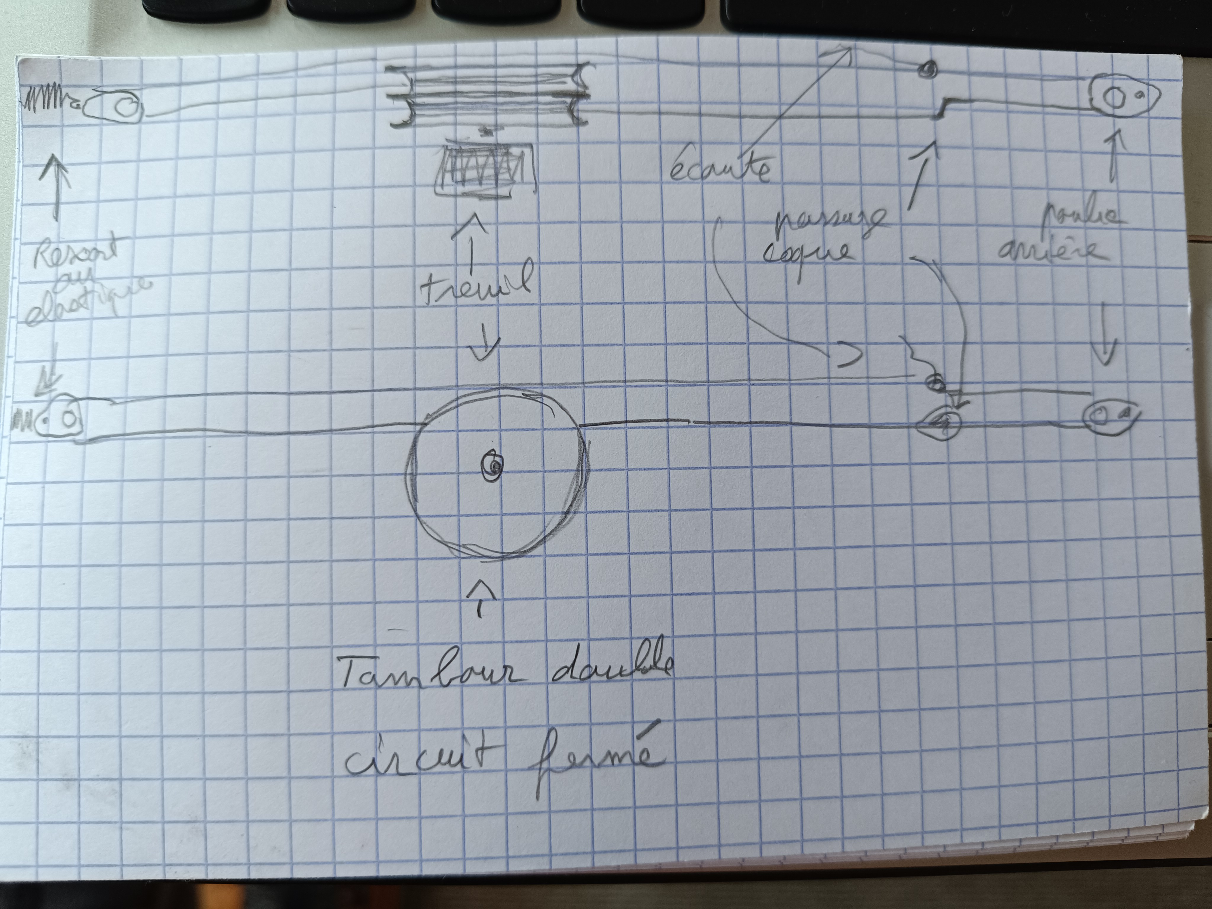 Il s'enroule sur le tambour du haut, sort derrière le pot, va à l'agrafe, puis à la poulie à l'arrière du bateau, passe dans la coque devant la trappe arrière, puis va sur une poulie à l'avant du bateau - cette poulie est volante et maintenue par un élastique de façon à ce que la tension soit constante dans le mouvement - enfin va s'enrouler sur la gorge du bas du tambour.