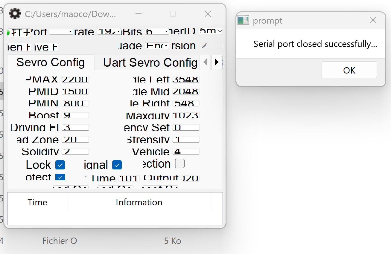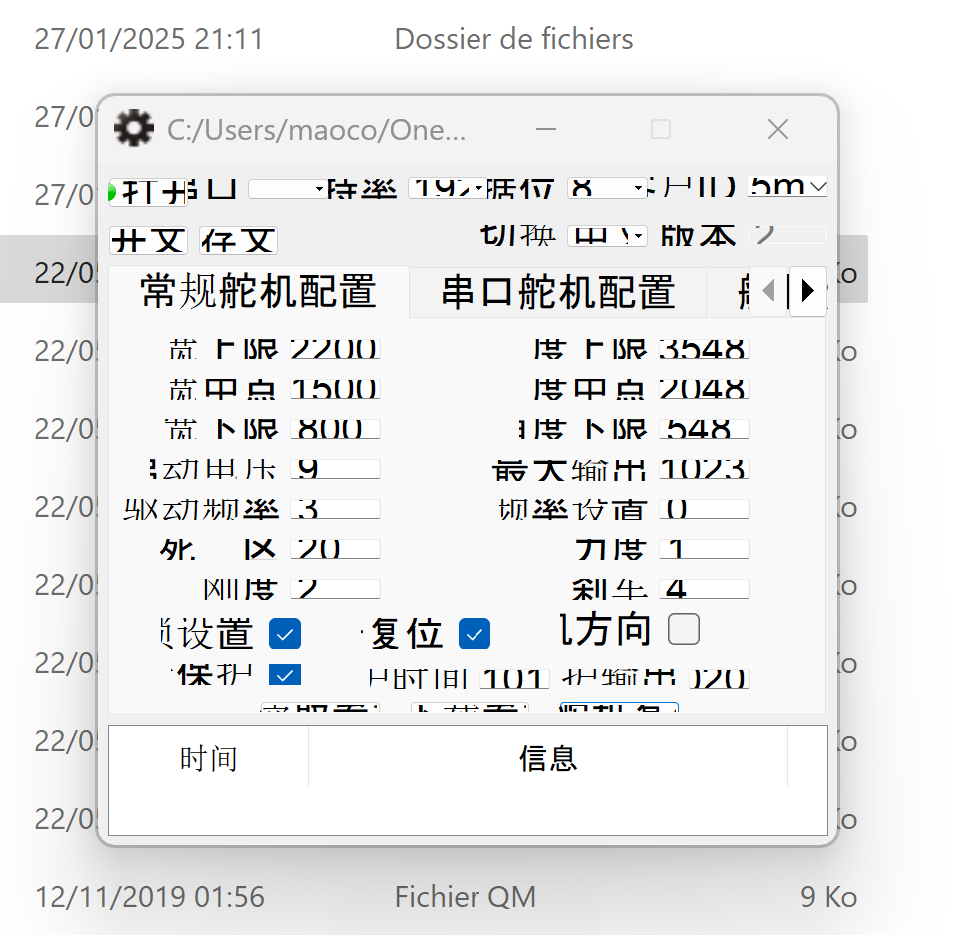 - En dessous le bouton de gauche permet de lire la configuration du servo, celui de droite de la sauvegarder sous la forme d'un fichier que l'on écrit sur son PC (histoire de faire une sauvegarde en cas de besoin).